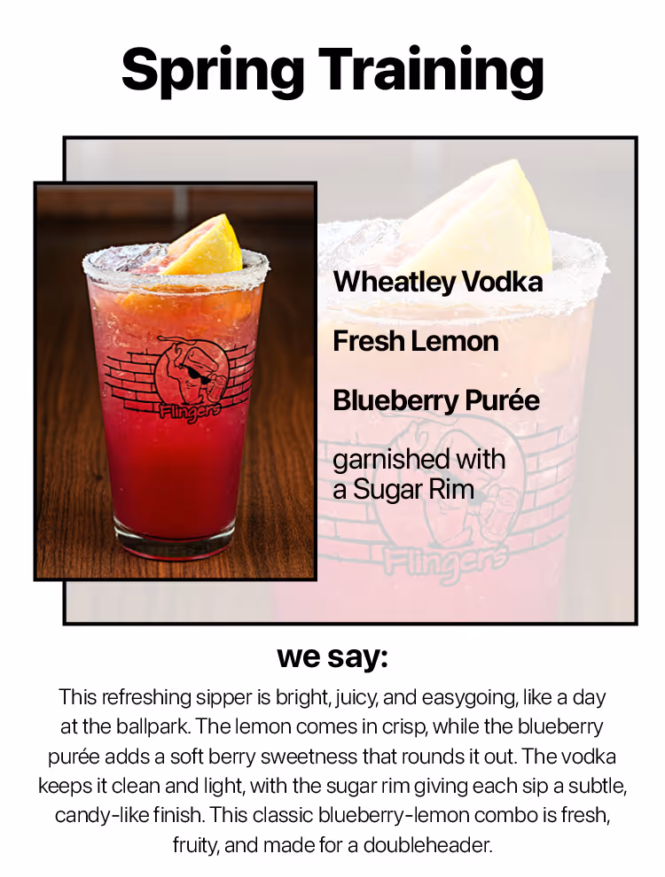 The best way to make the opening day roster is with our new cocktail called SPRING TRAINING. It’s bright, juicy, and easygoing, like a day at the ballpark. The lemon comes in crisp, while the blueberry purée adds a soft berry sweetness that rounds it out. The vodka keeps it clean and light, with the sugar rim giving each sip a subtle, candy-like finish. This classic blueberry-lemon combo is fresh, fruity, and made for a doubleheader.